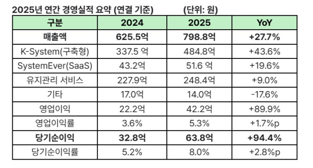 특히 구축형 ERP와 클라우드 서비스형소프트웨어(SaaS) 제품군이 함께 성장하고, 유지관리 서비스 매출도 증가하며 사업 전반의 균형 잡힌 성장이 이어졌다. 구축형 ERP를 중심으로 클라우드 및 운영·지원 서비스가 결합된 매출 구조를 통해 안정성과 확장성을 동시에 확보했다.