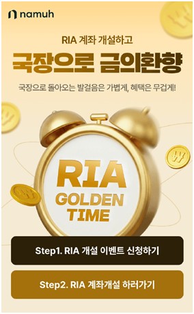 NH투자증권[005940]은 5월 31일까지 RIA 계좌 개설 고객에 대해 투자지원금 등을 제공하는 이벤트 'RIA 개설하고 국장으로 금의환향'을 진행한다.