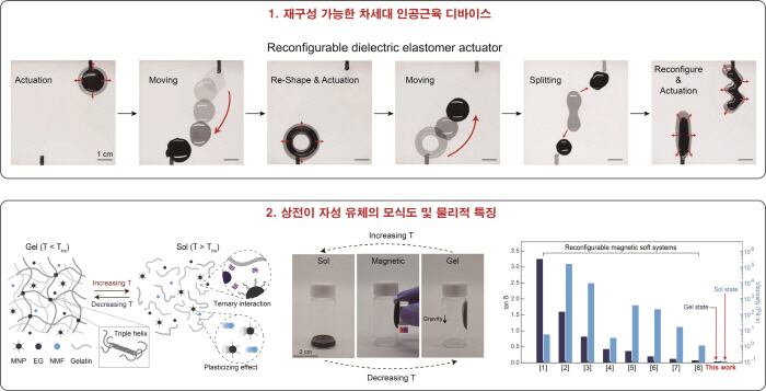 연구진은 이 문제를 해결하기 위해 필요에 따라 전극의 형태를 실시간으로 바꿔 새로운 기능을 수행하고, 찢기거나 전기적 단락이 발생해도 스스로 복구하는 차세대 소프트 젤 액추에이터를 개발했다. 새로 개발한 상전이 자성 유체 기반 전극은 필요에 따라 3차원 입체 구조로 쪼개지고 합쳐지는 동적인 재구성이 가능하다.