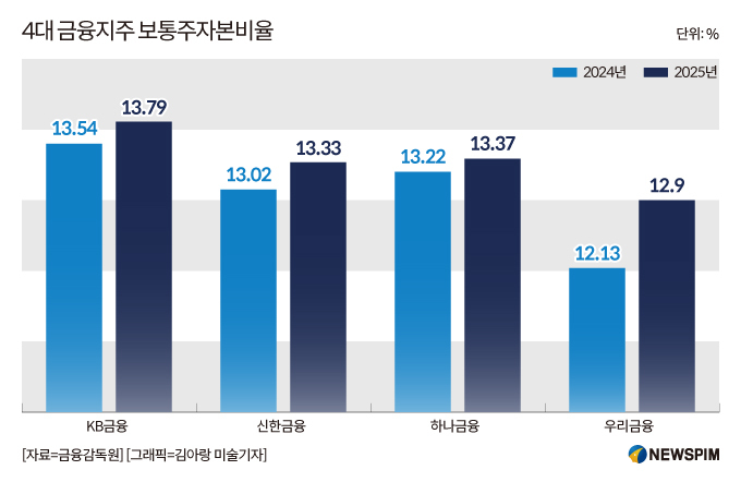 25일 금융권에 따르면 국내 주요 금융지주의 CET1 비율은 지난해 말 기준 12.25~13.79%로 집계됐다. KB금융그룹이 13.79%로 가장 높았고 하나금융(13.37%), 신한금융(13.22%)이 뒤를 이었다. 우리금융은 12.9%를 기록했다. 모두 금융당국 권고 수준인 12%를 웃도는 수준이다.