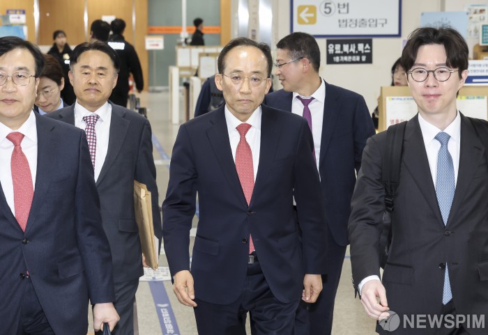 [서울=뉴스핌] 김현우 기자 = 비상계엄 해제 표결 방해 혐의를 받는 추경호 국민의힘 의원이 25일 오후 서울 서초구 서울중앙지방법원에 열린 첫 공판에 출석하고 있다. 2026.03.25 khwphoto@newspim.com