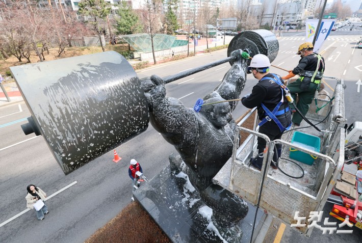봄맞이 목욕하는 조형물…'구석구석 깨끗하게'