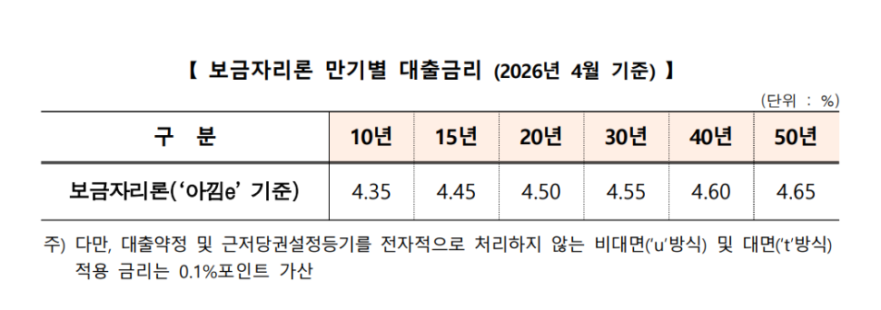 이에 따라 '아낌e-보금자리론' 기준으로 연 4.35(10년) ~ 4.65%(50년)가 적용된다.