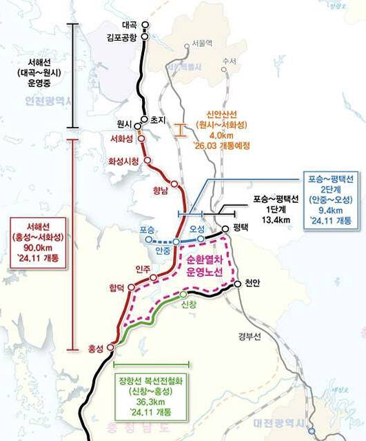 서해선 대곡~홍성 구간을 공용하는 KTX 이음열차는 애초 이달 개통 예정이었지만 원시~서화성 구간 공사 문제로 지연됐다. 서해선과 신안산선이 공용하는 원시~서화성 구간은 신안산선 민자사업자인 넥스트레인이 공사 중인데 아직 준공하지 못했다. 서해선 KTX가 개통하면 1차로 대곡~홍성 구간을 운행하고 장항선 공사가 완료되면 2차로 홍성~익산 구간까지 연결한다.