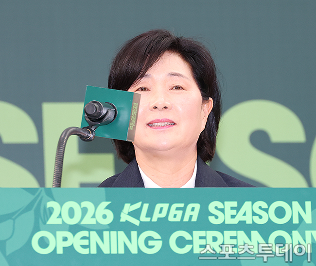 [스포츠투데이 권광일 기자] 김순희 KLPGA 수석부회장이 25일 오후 서울 영등포구 여의도 더현대 서울에서 열린 2026시즌 KLPGA 오프닝 세리머니 행사에 참석해 인사말을 전하고 있다. 2026.03.25.