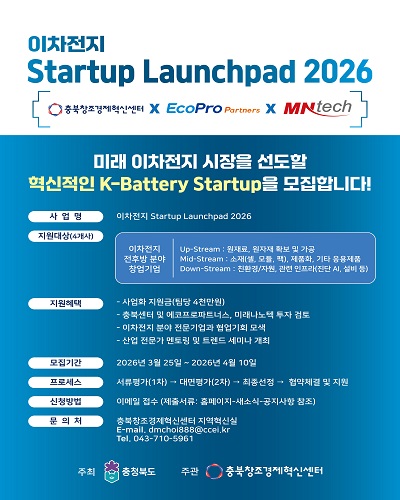 (청주=국제뉴스) 이상석 기자 = 충북도가 이차전지 혁신 기술을 보유한 스타트업을 발굴해 육성하는 '이차전지 스타트업 육성 플랫폼 구축 지원사업(이차전지 Startup Launchpad 2026)' 참여 기업을 4월 10일까지 모집한다.