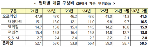 산업통상부는 25일 2월 주요 유통업체 매출이 전년 동월 대비 7.9% 증가했다고 밝혔다. 오프라인 매출은 14.1% 늘었고, 온라인 매출도 3.9% 증가했다. 온라인 매출은 2024년 10월 이후 17개월 연속 오프라인 매출 증가율을 웃돌았다.