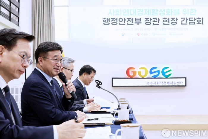 [서울=뉴스핌] 윤호중 행정안전부 장관이 25일 오전 광주사회적경제지원센터를 방문하여 사회적경제 현장의 우수사례 청취 및 발전 방안 등을 논의하는 간담회를 하고 있다.[사진=행정안전부] 2026.03.25 photo@newspim.com