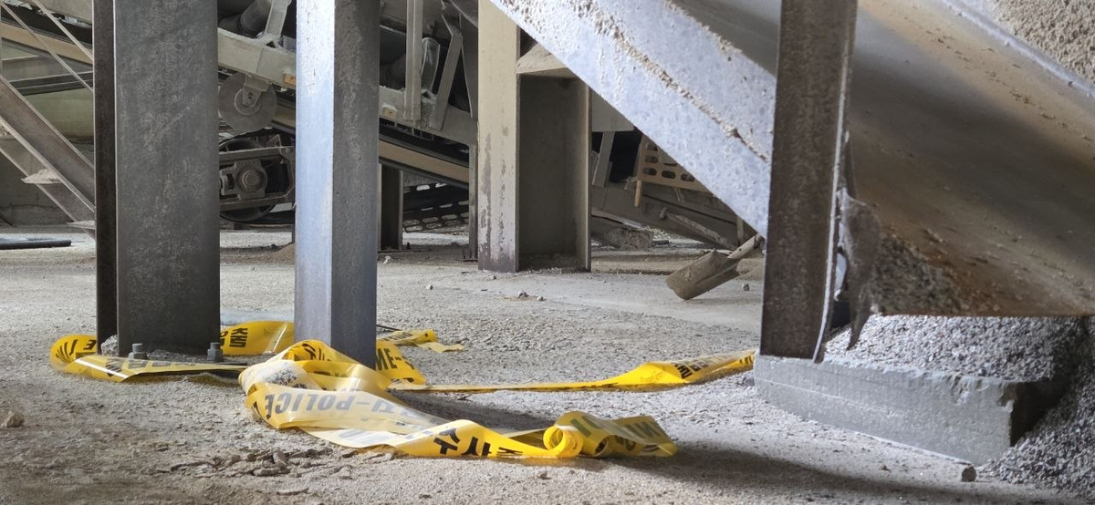 23일 이주노동자 뚜안이 끼임사고로 숨진 경기 이천시 자갈 가공업체에 설치돼 있던 폴리스라인이 바닥에 떨어져 있다. 경기이주평등연대 제공 |