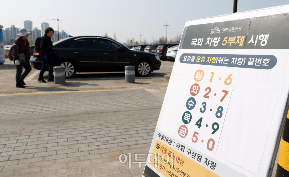 공공부문 차량 5부제 강화 시행 첫날인 25일 서울 여의도 국회 둔치주차장에 차량 5부제 안내문이 세워져 있다. 이번 조치는 정부가 원유 관련 자원안보 위기 경보를 '주의' 단계로 격상한 데 따른 에너지 수급 대응의 일환으로, 경차와 하이브리드차 등 기존 제외 차량도 적용 대상에 포함됐다. 고이란 기자 photoeran@ |
