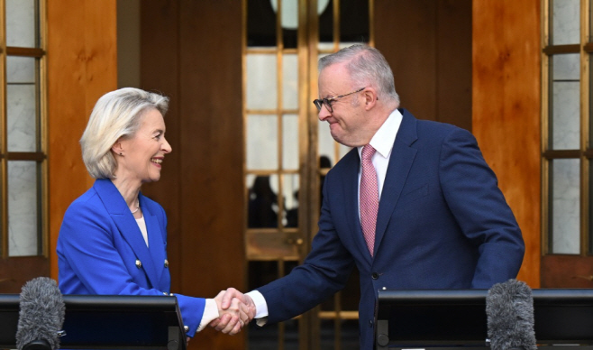 아시아투데이 이대원 시드니 통신원 = 유럽연합(EU)과 호주가 8년간의 협상 끝에 자유무역협정(FTA)을 체결했다. 우르줄라 폰데어라이엔 EU 집행위원장과 앤서니 앨버니지 호주 총리는 24일 캔버라에서 공동 기자회견을 열어 "세계 2위 경제권인 EU와의 포괄적 무역 협정이 글로벌 공급망 재편과 경제 안보 강화에 중요한 이정표가 될 것"이라고 밝혔다.