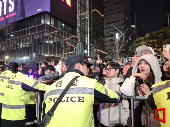 지난 21일 오후 8시께 서울 광화문 광장에서 방탄소년단(BTS) 컴백 공연이 시작되자 경찰이 시민 안전을 확보하기 위해 펜스 경계를 강화하고 있다. 오지은 기자