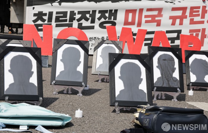 [서울=뉴스핌] 양윤모 기자 = 민주노총조합원들이 25일 오후 미국·이스라엘 침략전쟁 규탄! 파병 반대! 민주노총 결의대회를 청와대 앞에서 개최한 가운데,전쟁으로 희생된 이란 어린이를 추모하는 퍼포먼스가 펼쳐지고 있다. 2026.03.25 yym58@newspim.com