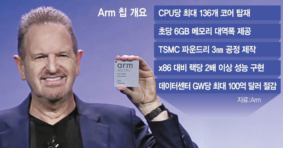 Arm AGI CPU는 회사 창립 35년 만에 처음 선보인 자체 칩이다. 대만 파운드리(반도체위탁 생산) 업체 TSMC의 3㎚(나노미터·10억분의 1m) 공정으로 제작된다. 300W(와트) 전력에서 최대 136개의 코어(명령어 처리 담당 부품)가 작동하도록 설계됐으며 대규모 전력이 필요한 AI 데이터센터의 에너지효율을 높이는 데 초점을 맞췄다.