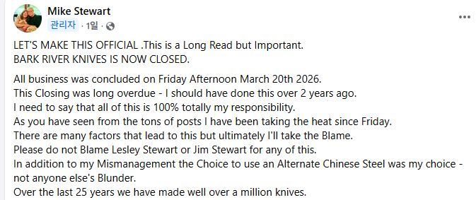 바크 리버 나이브스 운영자인 마이크 스튜어트의 페이스북 글. 그는 “중국산 강철을 사용하기로 한 결정은 전적으로 제 결정”이라며 “모든 책임은 제가 지겠다”고 했다. 마이크 스튜어트 페이스북 갈무리 |