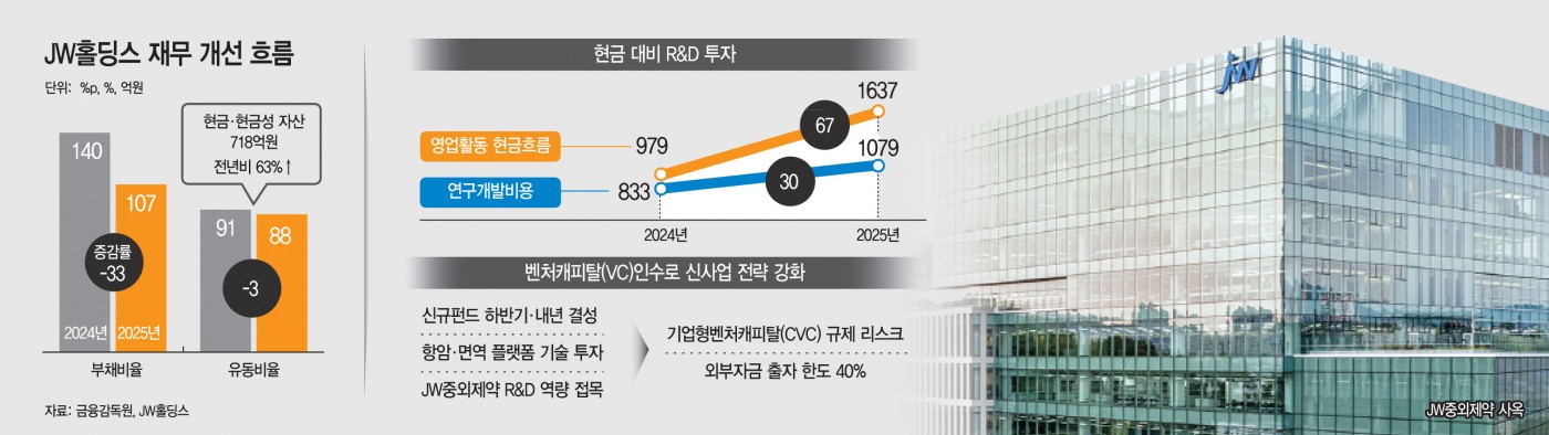 JW홀딩스가 제약·바이오 전문 벤처캐피털(VC) 솔리더스인베스트먼트(이하 솔리더스)를 인수하며 오픈 이노베이션 전략 강화에 나섰다. 재무구조 개선을 바탕으로 외부 바이오텍 투자까지 사업 영역을 확장하는 행보다. 다만 지주회사 구조상 VC 인수에 따른 공정거래법상 기업형벤처캐피털(CVC) 규제는 부담 요인으로 꼽힌다.