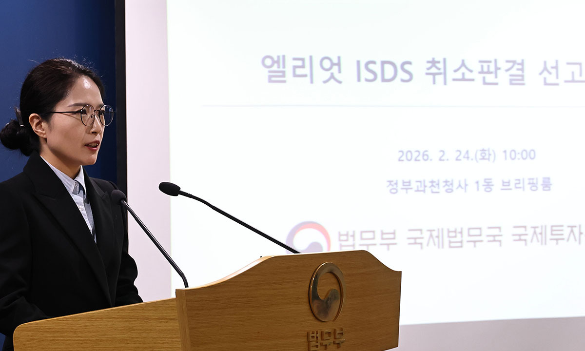 조아라 국제투자분쟁과장이 지난 2월 24일 경기도 정부과천청사 법무부에서 미국계 헤지펀드 엘리엇 매니지먼트와의 국제투자분쟁(ISDS) 취소판결 선고 브리핑을 하고 있다. 연합뉴스 |