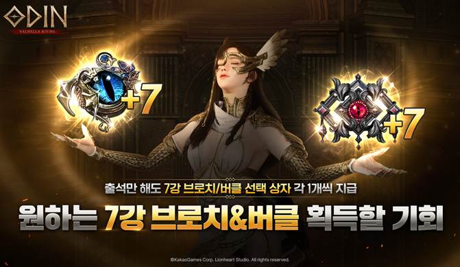 ‘오딘의 60일 특별 출석 시즌 VI’ 이벤트는 8월 5일까지 진행되며, 이용자는 매일 게임에 접속해 출석 일수에 따라 ‘+7 유일 브로치 선택 상자 패키지’, ‘+7 유일 버클 선택 상자 패키지’, 각종 소환권을 최대 330장 등 다양한 이벤트 보상을 획득할 수 있다.