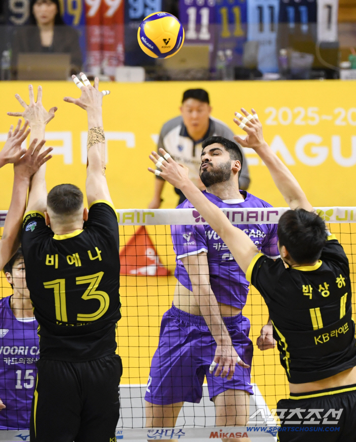 25일 의정부 경민대학교체육관에서 열린 V리그 남자부 준PO KB손해보험과 우리카드의 경기. 우리카드 알리가 상대 블로킹을 피해 공격을 시도하고 있다. 의정부=박재만 기자 pjm@sportschosun.com/2026.03.25/