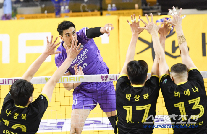 25일 의정부 경민대학교체육관에서 열린 V리그 남자부 준PO KB손해보험과 우리카드의 경기. 우리카드 아라우조가 상대 블로킹을 피해 공격을 시도하고 있다. 의정부=박재만 기자 pjm@sportschosun.com/2026.03.25/