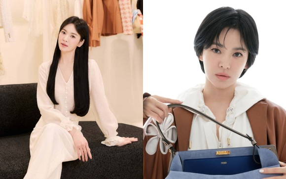 공개된 사진에는 명품 가방을 앞에 두고 포즈를 취하는 송혜교의 모습이 담겼다. 전날 공개한 긴 생머리의 사진과는 180도 다른 매력을 뽐내고 있다.