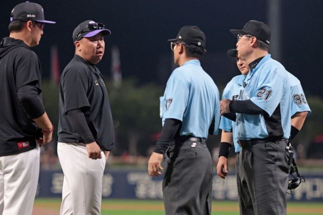 [서울=뉴스핌] KIA 이범호 감독이 박정우의 아웃에 대하여 심판에게 항의하고 있다. [사진 = KIA] 2025.08.21 wcn05002@newspim.com |