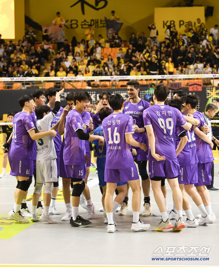 25일 의정부 경민대학교체육관에서 열린 V리그 남자부 준PO KB손해보험과 우리카드의 경기. 승리한 우리카드 선수들이 기뻐하고 있다. 의정부=박재만 기자 pjm@sportschosun.com/2026.03.25/