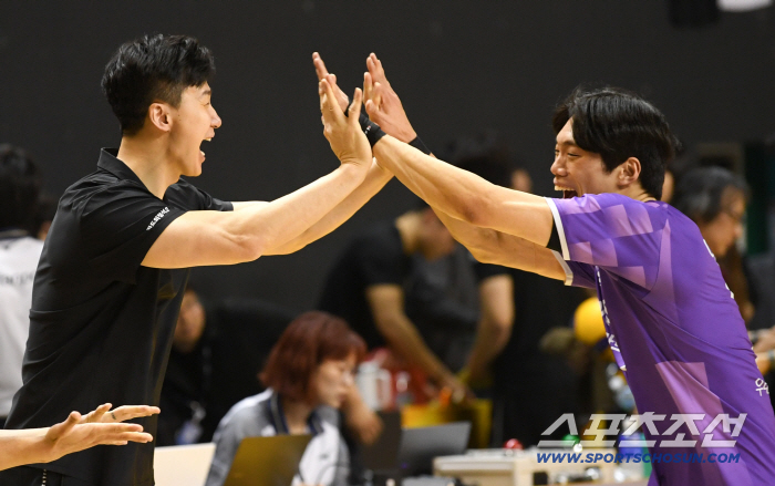 25일 의정부 경민대학교체육관에서 열린 V리그 남자부 준PO KB손해보험과 우리카드의 경기. 승리한 우리카드 선수들이 기뻐하고 있다. 의정부=박재만 기자 pjm@sportschosun.com/2026.03.25/
