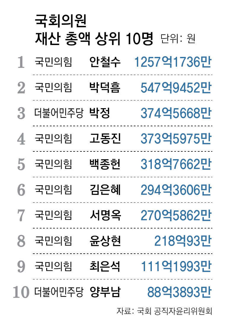 국회의원 중에선 삼성전자 사장 출신인 국민의힘 고동진 의원이 본인과 배우자, 차남 등이 삼성전자 주식을 총 6만1756주 보유하고 있다고 신고했다. 이에 따라 고 의원의 주식 가치는 직전 신고보다 35억7547만 원 늘어난 75억88만 원을 신고했다. 강은희 대구시교육감도 보유 중인 비상장 주식의 가치 상승 등으로 주식 평가액이 41억1661만 원 올라 281억7576만 원의 재산을 신고했다.