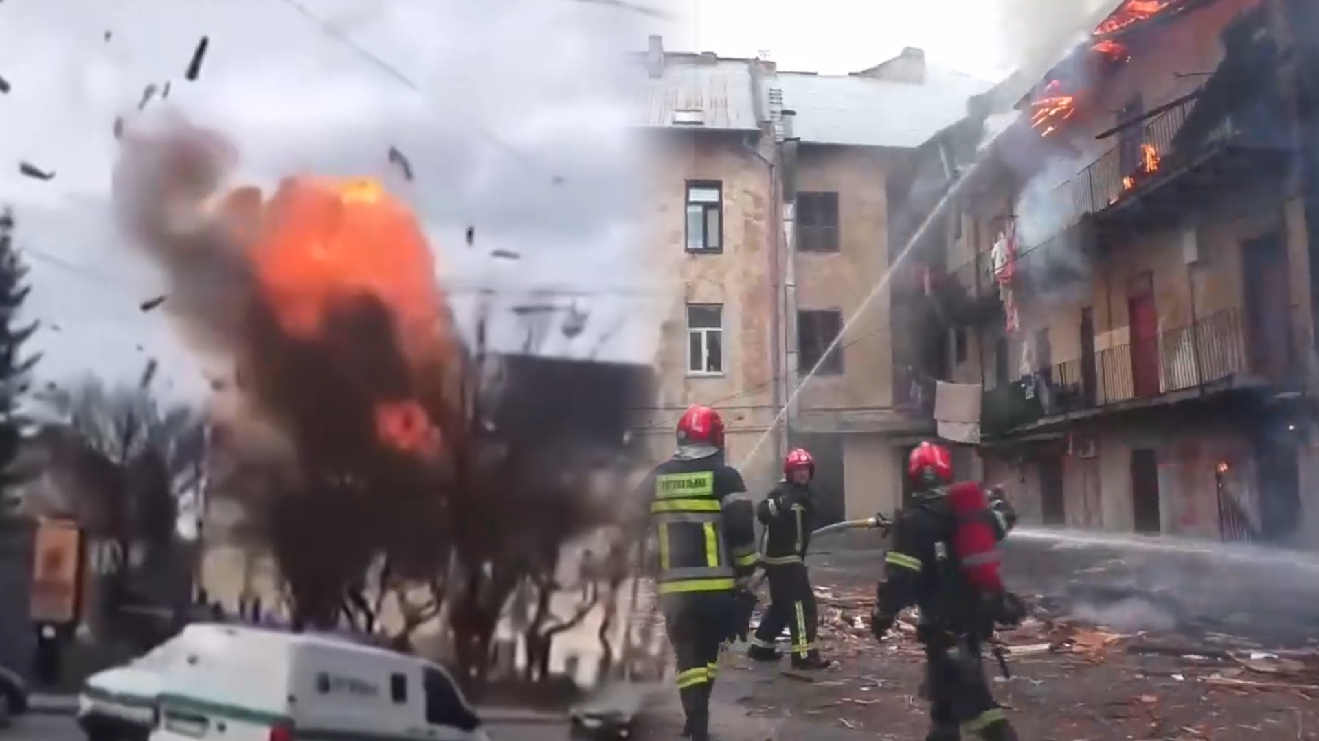 지붕이 뚫리며 파편이 사방으로 흩어지고, 도심 중앙은 순식간에 화염으로 뒤덮였습니다.