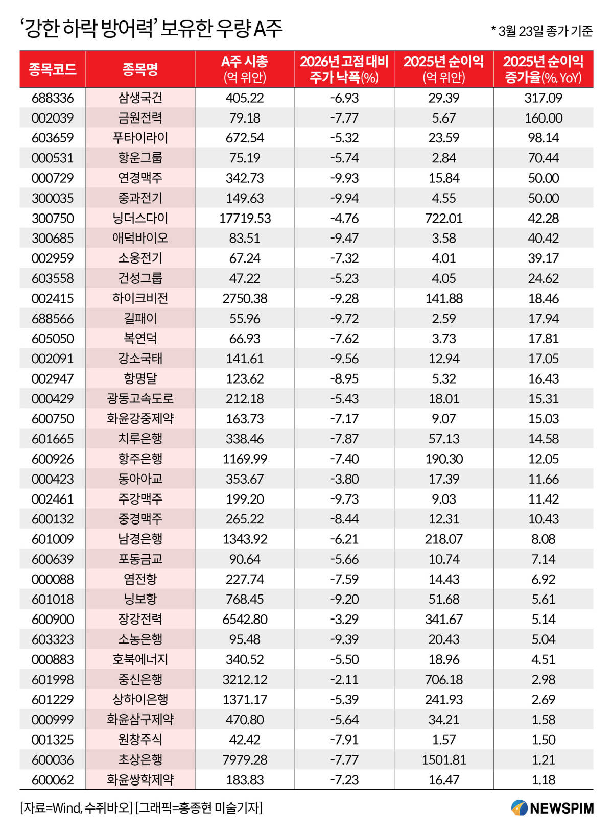 선별 기준은 △3월 23일 최신 종가 기준으로 연중 고점 대비 10% 미만의 낙폭을 기록한 종목 △3월 23일 종가 기준 12개월 선행 주가수익비율(PER)이 30배 미만인 종목 △2025년 연차보고서, 실적 속보치, 실적 전망치 순이익 하한선(하한선이 없을 경우 공시 수치 적용)을 기준으로 계산했을 때, 2025년 순이익이 흑자이면서 전년 대비 증가한 종목(적자 전환 후 흑자 포함)이다.