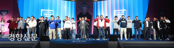 28일 개막하는 KBO리그의 10개 구단 감독과 선수들이 26일 서울 송파구 롯데호텔월드에서 열린 2026 프로야구 개막 미디어데이 행사에서 볼하트를 한 채 기념촬영을 하고 있다.