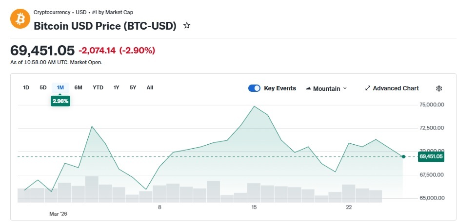 한국 시간 오후 7시 50분 기준 비트코인(BTC) 가격은 24시간 전보다 2.74% 하락한 6만9501달러에 거래되고 있다. 이더리움(ETH)은 4.93% 내린 2076달러를 기록했으며, 리플(XRP), 솔라나(SOL) 등 주요 알트코인도 3~4%대 하락세를 나타냈다.