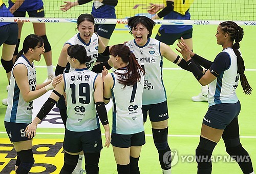 (수원=연합뉴스) 홍기원 기자 = 26일 경기도 수원체육관에서 열린 프로배구 V리그 여자부 플레이오프 1차전 현대건설과 GS칼텍스의 경기. 득점에 성공한 GS칼텍스 선수들이 기뻐하고 있다. 2026.3.26 xanadu@yna.co.kr