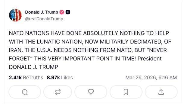 트럼프 대통령은 26일(현지시간) 소셜미디어 트루스 소셜에 올린 글에서 이란을 "군사적으로 궤멸 상태에 빠진 미친 나라"라고 규정하며, 나토 회원국들이 이번 작전에 "절대적으로 아무런 도움도 주지 않았다"고 맹비난했다. 그는 "미국은 나토로부터 필요한 것이 아무것도 없다"고 단언하면서도, 결정적인 시점에 협조하지 않은 동맹의 태도를 "결코 잊지 않겠다"고 경고했다.