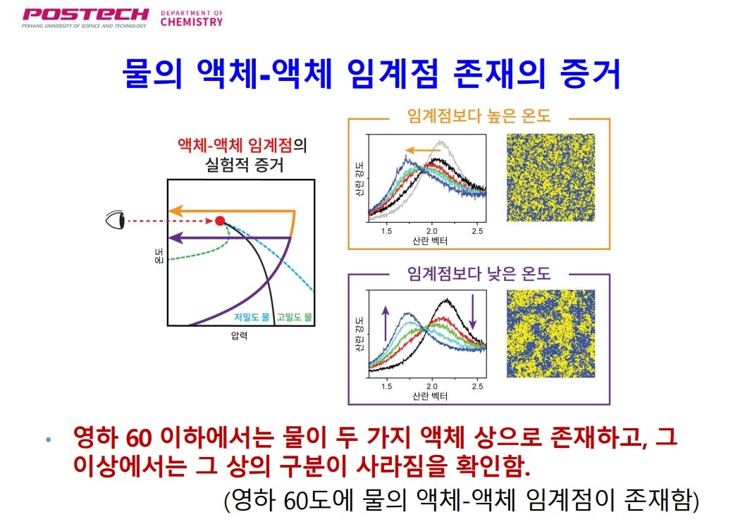 과학기술정보통신부는 27일 포항공과대(POSTECH) 김경환 교수 연구팀이 스웨덴 스톡홀름대학교 물리학과 앤더스 닐슨 교수팀과 공동 실험한 결과 물의 ‘액체-액체 임계점’을 처음 관측했다고 밝혔다.