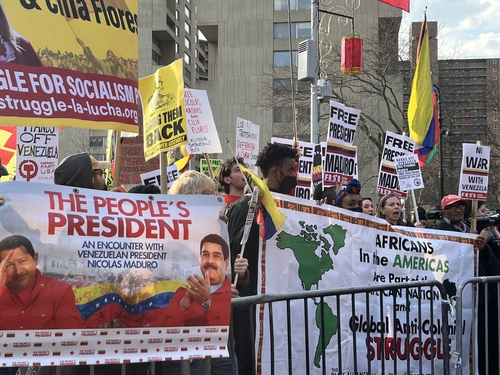 최대 약 70명 규모의 시위대는 법원 맞은편에서 "베네수엘라에서 손 떼라"(Hands off Venezuela), "마두로 대통령을 석방하라" 등의 구호를 외쳤다.