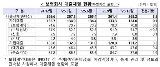 27일 금융감독원이 발표한 '2025년 12월 말 보험회사 대출채권 현황'에 따르면 지난해 12월 말 보험회사 대출채권 잔액은 265조2000억원으로 전분기 말보다 3조8000억원(1.5%) 증가했다. 보험권 총여신은 2024년 말 269조6000억원에서 2025년 9월 말 261조4000억원까지 줄었다가 4분기 들어 다시 증가했다.