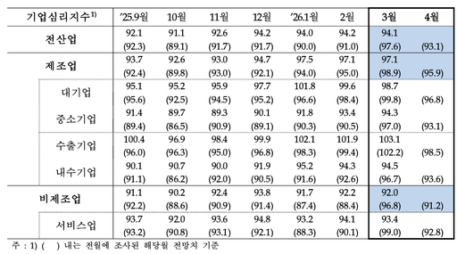 27일 한국은행이 발표한 '2026년 3월 기업경기조사 결과 및 경제심리지수(ESI)'에 따르면 이달 전산업 기업심리지수(CBSI)는 94.1로 전월보다 0.1포인트(p) 하락했다. CBSI가 장기평균인 100을 밑돌면 기업심리는 장기평균보다 비관적이라는 의미다. 3월에도 기준선을 밑돈 채 보합권에 머물렀다. 다만 다음달 전망 CBSI는 93.1로 전월 대비 4.5p 떨어져 체감보다 선행심리가 더 빠르게 악화하는 흐름이 확인됐다.