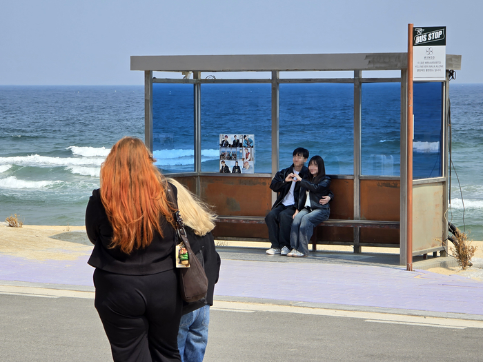 23일 BTS가 2017년 발매한 ‘You Never Walk Alone’ 앨범 커버를 촬영한 장소인 강원 강릉시 주문진 ‘BTS 버스정류장’에 BTS의 광화문 컴백 공연을 보러왔던 폴란드 싱가포르 등 외국인 관광객의 발길이 이어지고 있다. 사진 | 연합뉴스 |