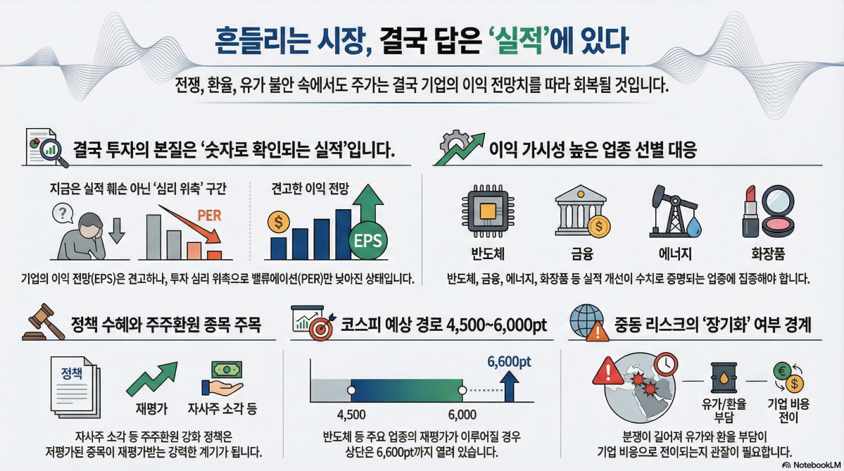 다만 위험 요인도 있다. 노 연구원은 “중동 리스크는 충돌 강도보다 장기화 여부가 더 위험할 수 있다”며 “전쟁이 길어질 경우 유가와 환율 부담이 실물경제와 기업 비용에 차례로 반영되며 시장에 더 큰 부담을 줄 수 있다”고 말했다. 이어 “기업 이익 전망이 약해지고 금융시장 불안이 커지거나 AI 중간 밸류체인 충격이 현실화하면 시장의 무게중심은 성장주에서 안정성과 퀄리티 업종으로 이동할 수 있다”고 덧붙였다.