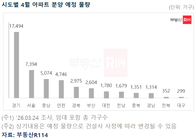 부동산R114 관계자는 “4월은 전통적인 분양 성수기인 데다 당초 이번달 예정된 물량 일부가 이월됐다”며 “또 6월 지방선거 전 분양일정을 소화하려는 단지가 많아졌다”고 전했다. 또 “주변 아파트 시세와 분양가의 차이가 크면 시세차익 일부를 환수하는 주택채권입찰제 도입 논의까지 더해지며 불확실성은 한층 커진 모습”이라며 “일부 단지는 공급 시기를 조정할 가능성도 있어 계획 물량의 변동이 많을 것으로 예상된다”고 말했다.