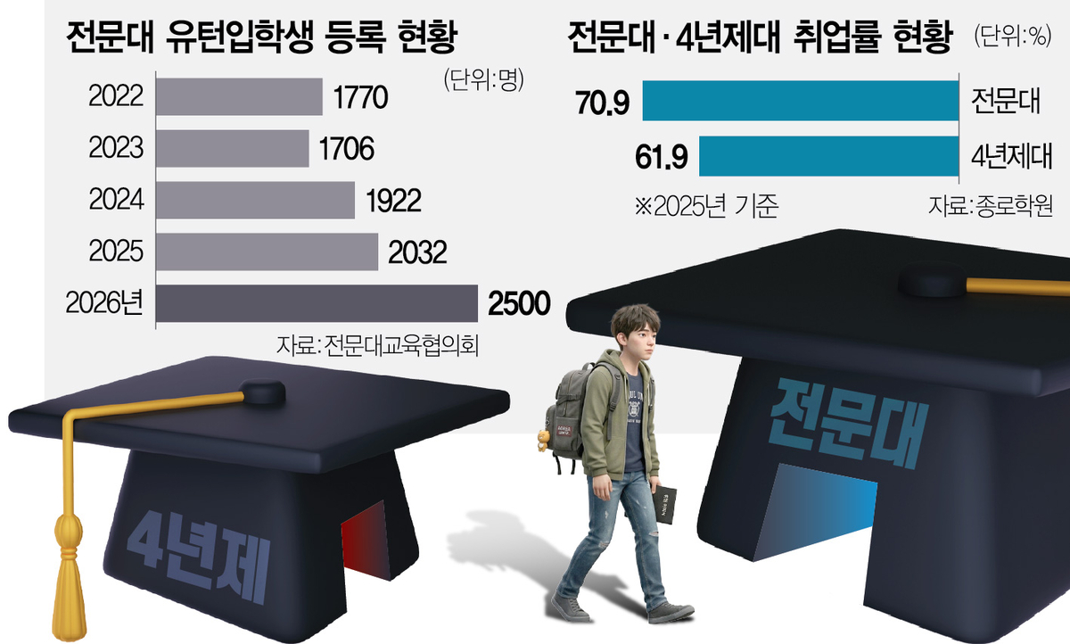 이에 2~3년 과정으로 부담이 적고 비교적 취업이 보장된 전문대로 청년들이 발길을 돌리고 있다. 지난해 기준 전문대 취업률은 70.9%로 4년제 대학의 61.9%보다 높았다. 유턴 입학생 증가에 대해 강광천 전문대교육협의회 입학지원실장은 “주로 인문사회계열 전공 졸업생들이 취업난을 겪으면서 전문대로 유입되고 있다”며 “최근 유망 직업군이 빠르게 변화하자 평생 활용 가능한 자격증을 갖추려는 청년이 늘고 있다”고 설명했다. 기업들이 실무 역량을 갖춘 중고 신입을 선호하는 현상과 고령화 속 정년에 구애받지 않는 기술을 배우려는 수요가 맞물린 결과라는 분석이다.