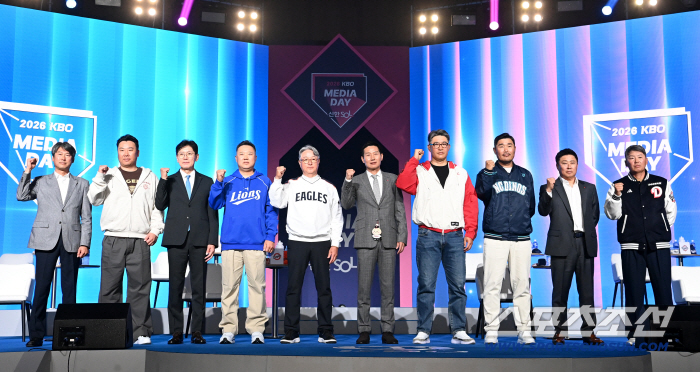 26일 롯데호텔 월드에서 열린 2026 KBO 리그 미디어데이&팬페스트. 10개구단 감독들이 포즈를 취하고 있다. 왼쪽부터 키움 설종진, KIA 이범호, KT 이강철, 삼성 박진만, 한화 김경문, LG 염경엽, SSG 이숭용, NC 이호준, 롯데 김태형, 두산 김원형 감독이 포즈를 취하고 있다. 잠실=허상욱 기자wook@sportschosun.com/2026.03.26/ |