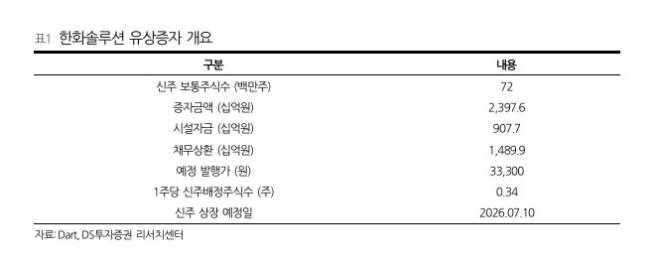 전날 한화솔루션은 신주 7200만주를 발행하기 위해 주주배정 유상증자를 단행한다고 공시했다. 규모는 총 2조3976억원이다. 주당 3만3300원에 발행하는 셈이다. 조달한 자금 중 9077억원은 시설자금에, 1조4899억원은 채무상환에 사용할 예정이다. 이같은 소식이 전해지자 주가는 18% 하락했다.