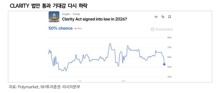 정책 불확실성은 당분간 이어질 전망이다. 클래리티 법안 통과 가능성은 최근 예측시장에서 40~50% 수준으로 낮아지며 입법 지연 우려가 커진 상황이다. 법안 논의가 지연될 경우 디지털자산 산업 전반에는 부정적 영향을 줄 수 있다는 평가다.