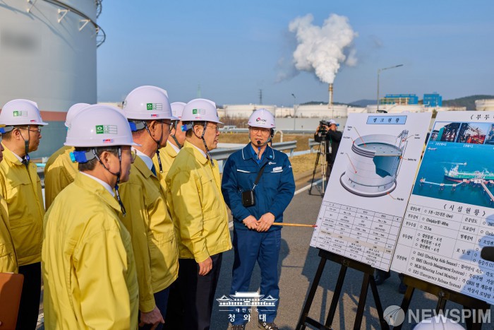 [서울=뉴스핌] 이재명 대통령이 지난 26일 서산시 대산읍 한국석유공사 서산비축기지를 방문해 비축유 관리 현황을 보고 받고 있다. [사진=청와대] 2026.03.27 photo@newspim.com