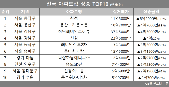 부동산 플랫폼 호갱노노에 따르면 26일 신고일 기준 전국 아파트 가운데 실거래가 상승 폭이 가장 컸던 단지는 서울 동작구 ‘한성’으로 나타났다. 이 단지는 11억5000만원에 거래되며 직전 거래 대비 6억2000만원(116%) 상승했다.