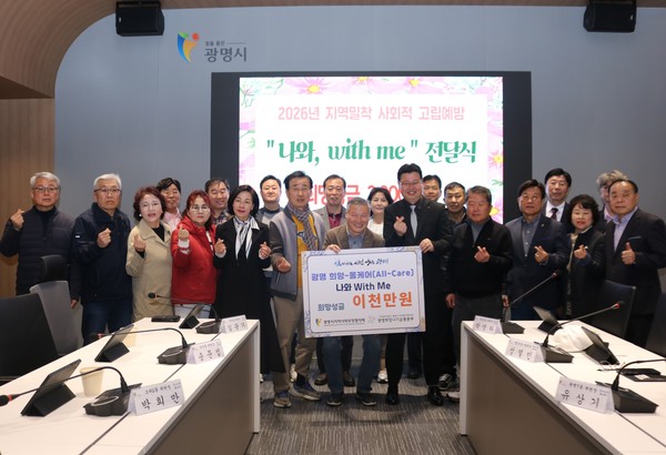 (광명=국제뉴스) 윤은중 기자 = 광명시는 지난 3월 26일 19개 동 지역사회보장협의체 위원장과 함께 광명 희망-올케어(All-Care) '나와, 위드 미(with me)' 희망성금 전달식을 열고 2026년 지역밀착형 고독사 예방사업의 시작을 알렸다.