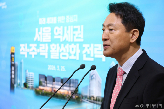 [서울=뉴시스] 황준선 기자 = 오세훈 서울시장이 25일 오전 서울 중구 서울시청에서 열린 서울 역세권 직·주·락 활성화 전략 기자설명회에서 발언하고 있다. 2026.03.25. hwang@newsis.com /사진=황준선 |